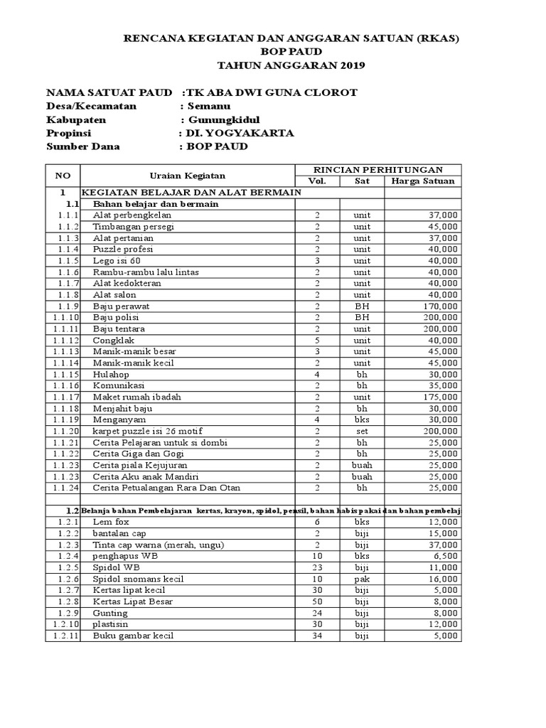 Rkas Paud 2021 from imgv2-2-f.scribdassets.com #rkasbos #bos2021 #arkasbos cara menyusun rkas bos reguler 2021 dimasa pandemi tahun sudah berganti, dan bku penggunaan dana bos telah ditutup per. Unduh aplikasi rkas manual format excel 2020 unduh aplikasi rkas dan lpj bos 2020 full aplikasi rapor terbaru 2020 demikianlah kiranya berbagi informasi dan file mengenai aplikasi rkas format excel. Sebagai bahan penyusunan rkas tahun 2021, bapak atau ibu selaku bendahara sekolah dapat menyimak file berikut. Berikut ini saya berikan contoh rkas bos 2021 berisi contoh rkas 2021 excel sd smp sma sesuai juknis bos 2021 kemendikbud. Berapa besaran nominal yang diterima, penggunaan, dan hingga format. Format rkas arkas manual serba otomatis anggaran tahun 2021 ini sengaja dibuat oleh tim bos kecamatan sobang yang salah satunya adalah opk (operator kecamatan) fungsinya adalah untuk mempermudah pembuatan laporan anggaran rkas tahun 2021 satuan pendidikan sekolah negeri dan swasta di kecamatan sobang. Format rkas otomatis tahun anggaran 2021 ini sengaja dibuat oleh tim bos kecamatan sobang yang salah satunya adalah opk (operator kecamatan) fungsinya adalah untuk mempermudah pembuatan laporan anggaran rkas tahun 2021 satuan pendidikan sekolah negeri dan swasta yang berada di wilayah kecamatan sobang. Tidak luput dari laporan spj bos, pembuatan rkas (rencana kegiatan anggaran sekolah) ini pun sama pentingnya demi kelancaran output dan input dana di instansi sekolah.