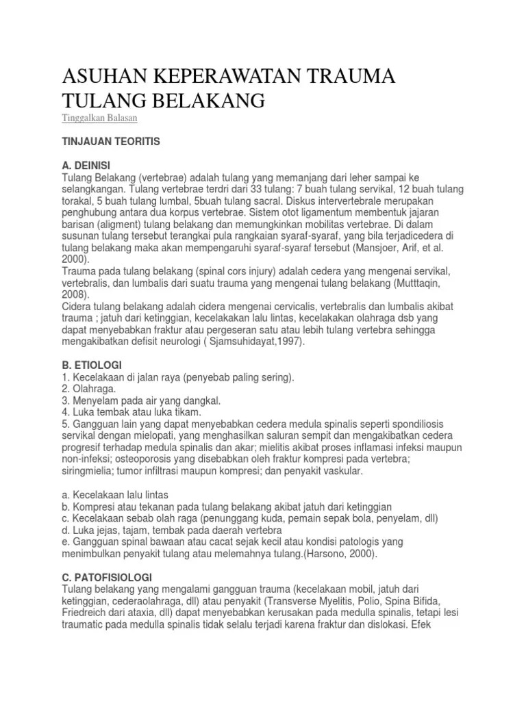 Latar belakang trauma medulla spinalis adalah suatu fraktur atau pergeseran dari satu/lebih tulang vertebra yang menyebabkan kerusakan medulla spinalis dan . Mampu memberikan asuhan keperawatan kepada pasien dengan gangguan. Trauma medula spinalis adalah cedera pada tulang belakang baik langsung maupun tidak langsung, yang menyebabkan lesi di medula spinalis sehingga menimbulkan . Medulla spinalis oleh berbagai keadaan akibat trauma pada tulang. Pada lesi di medula oblongata atau akibat gangguan perifer, .